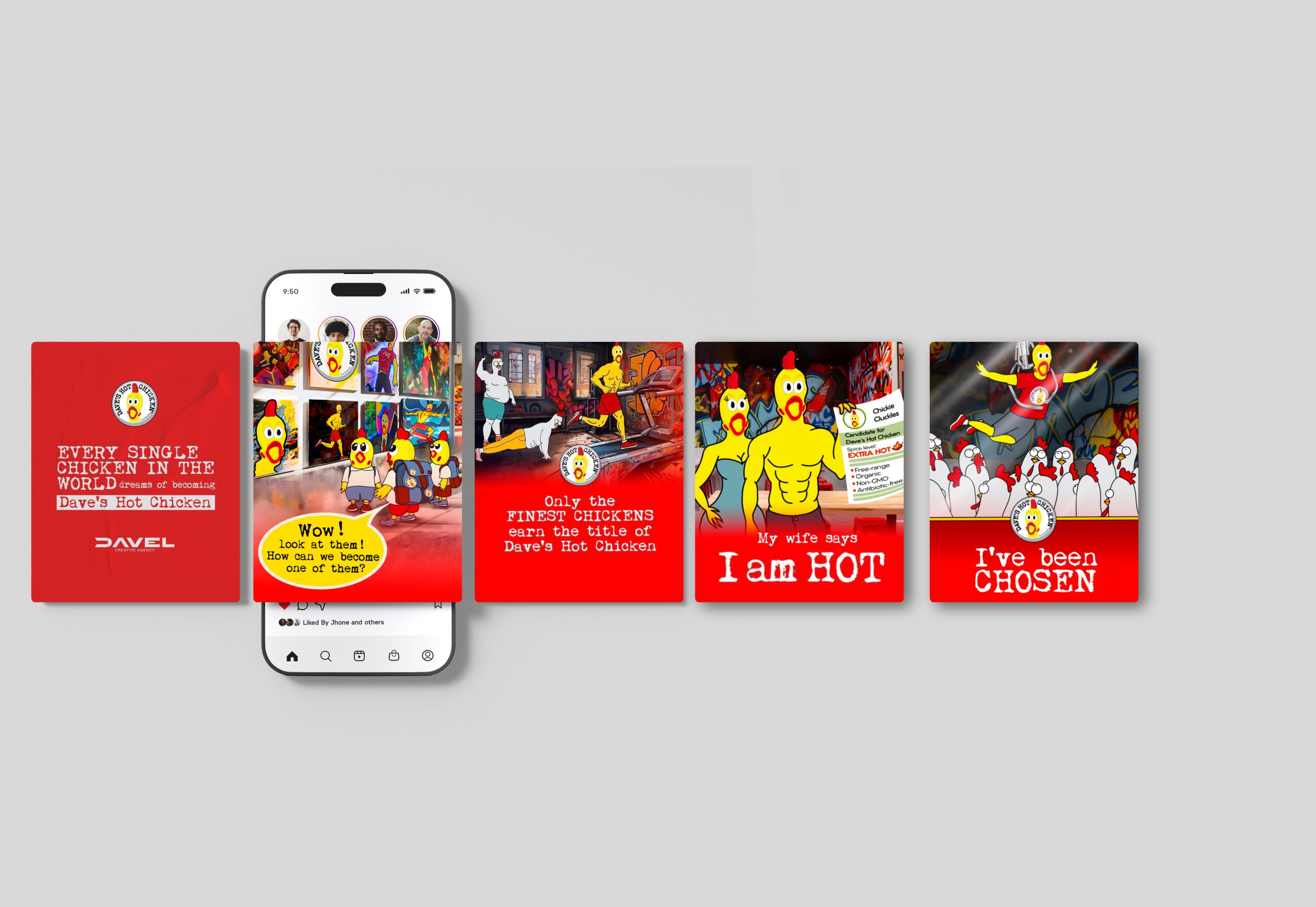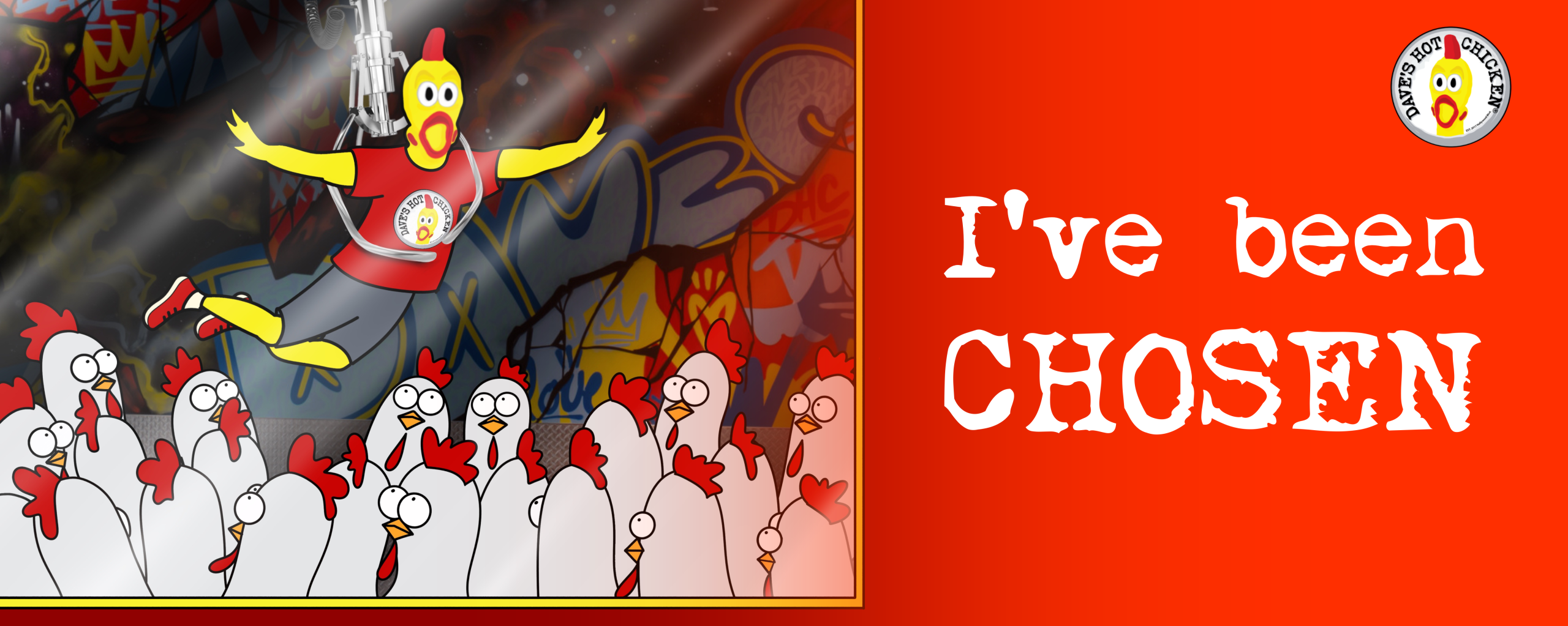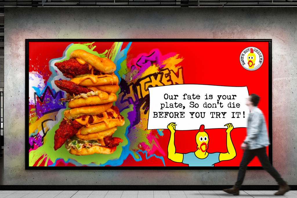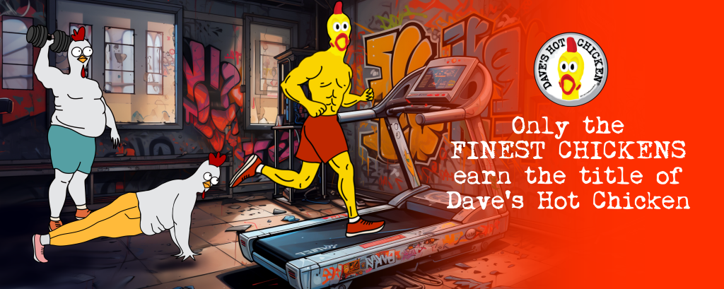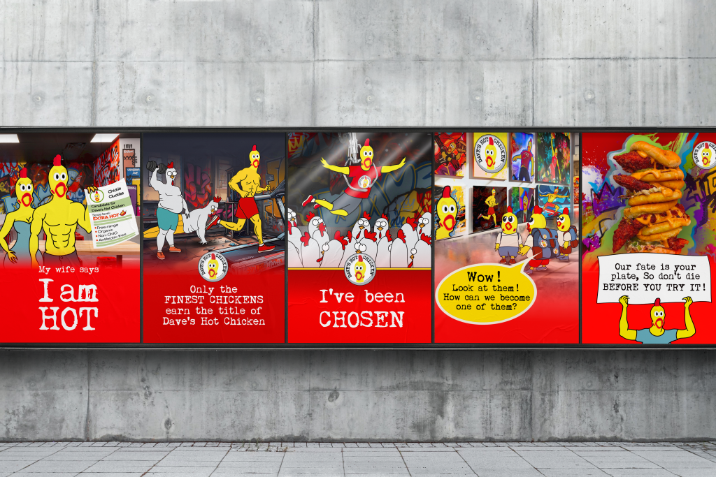 The concept of our marketing campaign, “The Dave’s Hot Chicken Dreamers,” is a whimsical journey into the lives of chickens who dream of becoming the finest at Dave’s. The campaign spotlights the unwavering commitment to quality, as only organic, non-GMO, free-range, and antibiotic-free chickens make it to Dave’s menu.With a touch of dark humor and a pinch of fantasy, we bring you the stories of chicken ambition.